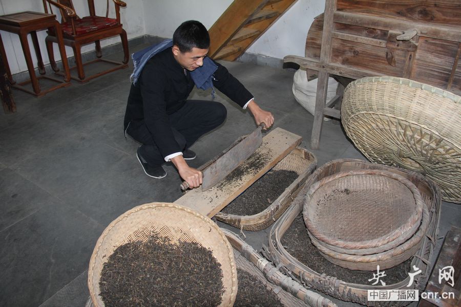 走進位于咸陽世紀大道旁的涇渭茯茶公司,一座國內目前工藝設計最先進、生產能力最大的黑茶生產車間引人注目,而更吸引記者眼光的則是位于現代化廠區(qū)中央的一座傳統(tǒng)關中民居小院內的古茯茶手工作坊。在這里,柳條筐、竹篾籃、木質風車、茶磚!瓪v經滄桑的手筑茯茶工藝正在老茶工的手指上復活。