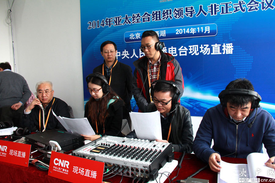 劉曉龍副總編和總編室副主任胡國華與APEC報(bào)道人員在做直播前準(zhǔn)備