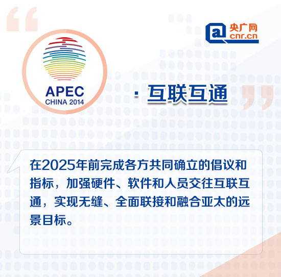 《北京綱領(lǐng)》中提到,我們認(rèn)識(shí)到加強(qiáng)全方位基礎(chǔ)設(shè)施與互聯(lián)互通建設(shè)有助于開拓經(jīng)濟(jì)增長(zhǎng)新動(dòng)力,推動(dòng)互助合作,促進(jìn)亞太繁榮和大家庭精神。我們高度評(píng)價(jià)亞太經(jīng)合組織在基礎(chǔ)設(shè)施與互聯(lián)互通建設(shè)領(lǐng)域取得的成果。在2025年前完成各方共同確立的倡議和指標(biāo),加強(qiáng)硬件、軟件和人員交往互聯(lián)互通,實(shí)現(xiàn)無縫、全面聯(lián)接和融合亞太的遠(yuǎn)景目標(biāo)。