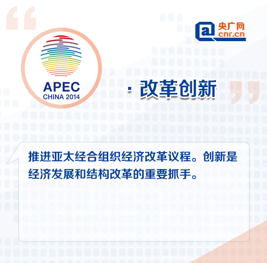 《北京綱領(lǐng)》中表示,經(jīng)濟(jì)創(chuàng)新發(fā)展、改革與增長(zhǎng)三者互補(bǔ)互進(jìn),將決定亞太經(jīng)合組織共同繁榮的前景。亞太地區(qū)正處于經(jīng)濟(jì)轉(zhuǎn)型的關(guān)鍵時(shí)期,我們將致力于加快改革和創(chuàng)新步伐,探索新興增長(zhǎng)領(lǐng)域,鞏固亞太地區(qū)全球經(jīng)濟(jì)增長(zhǎng)引擎地位。加強(qiáng)宏觀經(jīng)濟(jì)政策協(xié)調(diào),實(shí)現(xiàn)協(xié)同增效,為本地區(qū)經(jīng)濟(jì)強(qiáng)勁、可持續(xù)、平衡和包容增長(zhǎng)創(chuàng)造良好政策環(huán)境。推進(jìn)亞太經(jīng)合組織經(jīng)濟(jì)改革議程,創(chuàng)新是經(jīng)濟(jì)發(fā)展和結(jié)構(gòu)改革的重要抓手。
