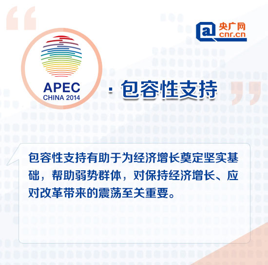 《北京綱領(lǐng)》中表示,包容性支持有助于為經(jīng)濟(jì)增長(zhǎng)奠定堅(jiān)實(shí)基礎(chǔ),幫助弱勢(shì)群體,對(duì)保持經(jīng)濟(jì)增長(zhǎng)、應(yīng)對(duì)改革帶來的震蕩至關(guān)重要。我們歡迎第六屆亞太經(jīng)合組織人力資源開發(fā)部長(zhǎng)會(huì)議的成果和促進(jìn)高質(zhì)量就業(yè)和開發(fā)人力資源加強(qiáng)人員交往互聯(lián)互通行動(dòng)計(jì)劃。