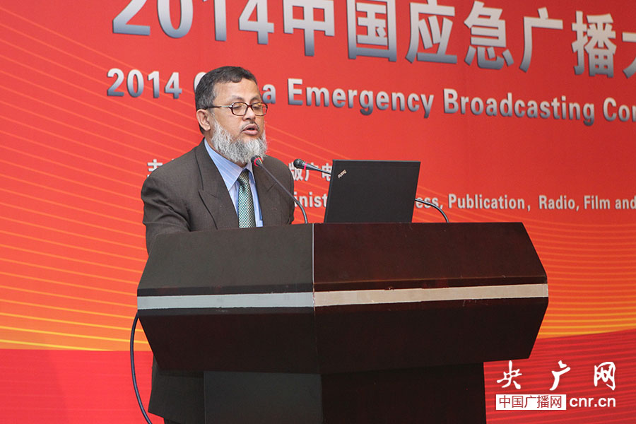 圖為孟加拉電臺對外聯(lián)絡部主任納斯魯拉·艾爾凡發(fā)言。(央廣網(wǎng)記者杜虎_攝)