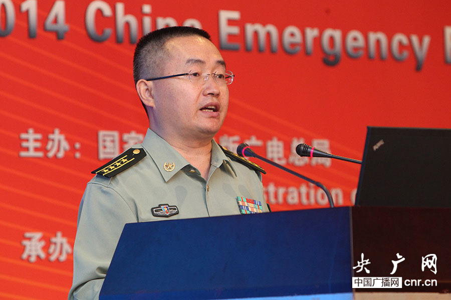 圖為中國人民解放軍總參謀部應(yīng)急辦副主任吳喜鏵發(fā)言。(央廣網(wǎng)記者杜虎_攝)