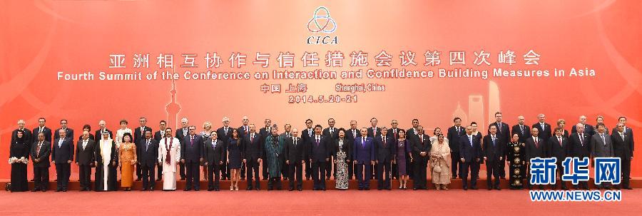 5月20日,國家主席習近平在上海國際會議中心舉行宴會,代表中國政府和人民,歡迎前來出席亞洲相互協(xié)作與信任措施會議第四次峰會的各國貴賓。這是習近平和夫人彭麗媛同與會外國及國際組織的領導人和代表夫婦集體合影。新華社記者 馬占成 攝