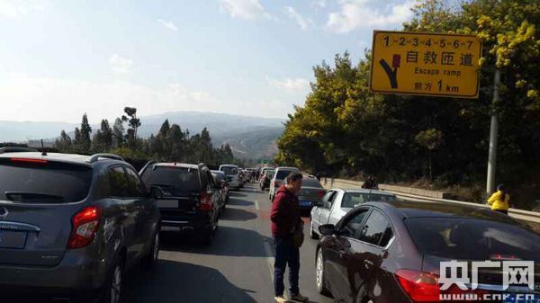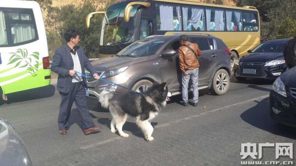 央廣網(wǎng)北京2月20日消息(記者杜虎)大年初二,出嫁的女兒帶著丈夫及兒女回娘家拜年。中午11時(shí)許,昆明到石林高速大堵車(chē),高速公路變停車(chē)場(chǎng),網(wǎng)友下車(chē)路邊遛狗。