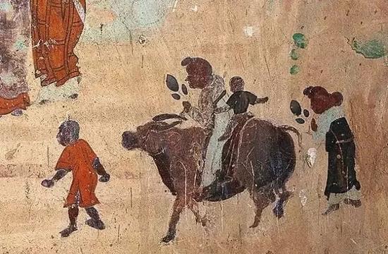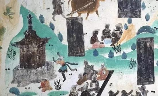 比如莫高窟壁畫中有牛頭山圖,是佛教自印度經(jīng)于闐東傳中國的縮影之一。莫高窟第454窟牛頭山圣跡圖中就有登天梯的畫面,天梯巧妙的穿過牛頭,攀登天梯的人顯的極為渺小,畫師繪制通過大小對(duì)比,凸顯出牛頭龐大的體量感。牛頭山據(jù)說就在今天新疆的和田綠洲西南部。