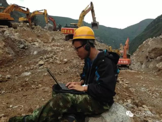 白杰戈在魯?shù)榈卣馂?zāi)區(qū)堰塞湖排險(xiǎn)現(xiàn)場做錄音報(bào)道