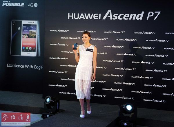 6月11日,模特在發(fā)布會(huì)上展示華為新款手機(jī)。當(dāng)日,華為在香港推出新產(chǎn)品Ascend P7智能手機(jī)。新華社發(fā)(黃燕華 攝)