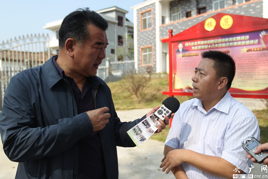 圖為王求就老區(qū)扶貧變輸血為造血等問題對荷花鄉(xiāng)黨委書記謝忠發(fā)進(jìn)行了采訪。央廣網(wǎng)記者 李聰格 攝