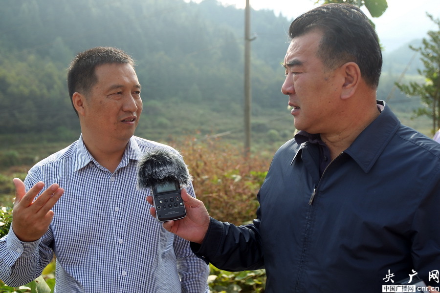 紀(jì)念紅軍長(zhǎng)征八十周年,中央人民廣播電臺(tái)《長(zhǎng)征,從這里出發(fā)》特別報(bào)道組繼續(xù)在江西革命老區(qū)尋訪紅色足跡,展望金色未來。12日,采訪組來到革命圣地井岡山,對(duì)井岡山新開發(fā)的旅游實(shí)驗(yàn)區(qū)——“山地人家”進(jìn)行采訪報(bào)道。圖為王求就這種創(chuàng)新型農(nóng)家樂發(fā)展情況對(duì)茅坪鄉(xiāng)黨委書記蘭勝華進(jìn)行了采訪。央廣網(wǎng)記者 李聰格 攝