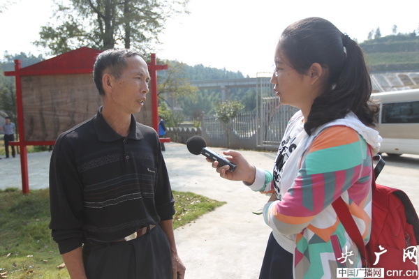 為紀(jì)念紅軍長(zhǎng)征八十周年,中央人民廣播電臺(tái)臺(tái)長(zhǎng)王求率《長(zhǎng)征,從這里出發(fā)》特別報(bào)道組重新回到長(zhǎng)征出發(fā)的地方,尋訪紅色的足跡,看蘇區(qū)振興如何迎來“新長(zhǎng)征”。圖為江西臺(tái)記者王瑩在荷花鄉(xiāng)蒼沖村采訪村書記丘石林。央廣網(wǎng)記者 李聰格 攝