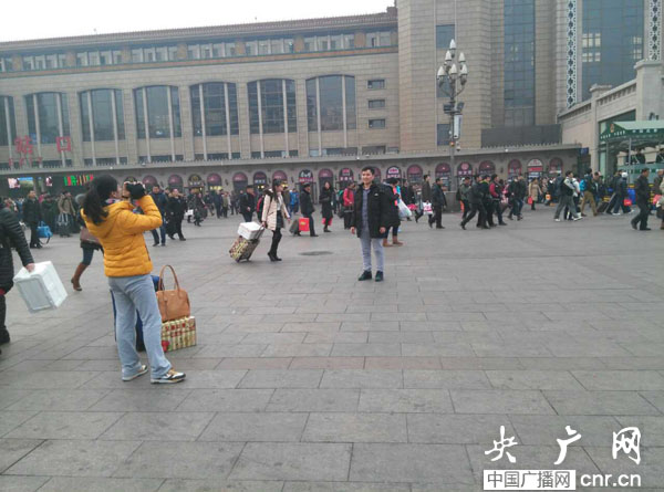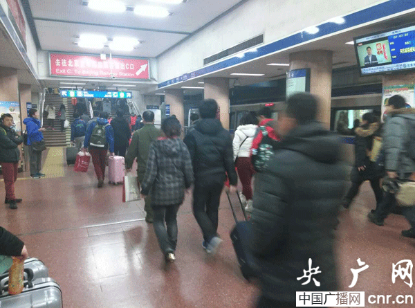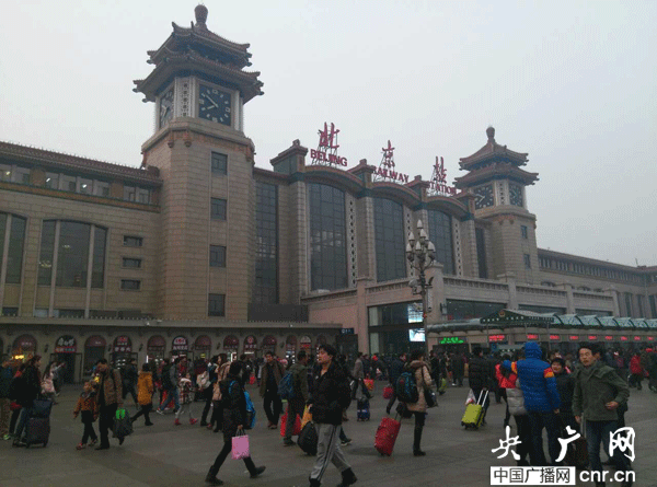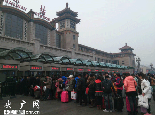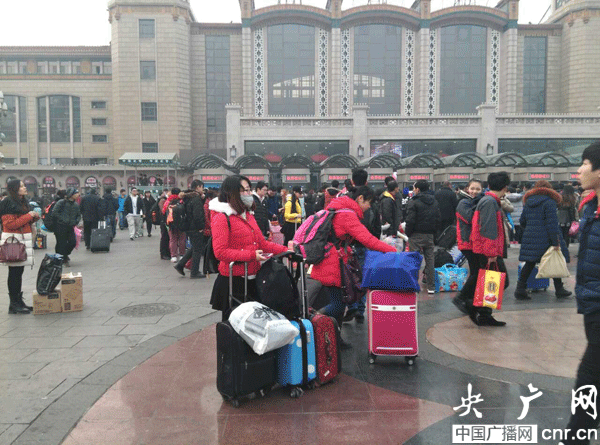 記者劉會民:我現(xiàn)在所在的位置是北京站的廣場上,熙熙攘攘的人很多,大家手里拿著大包小包。驗票進站那里排著長長的隊伍,大家臉上的表情還是比較焦急的,看的出來回家的心情很迫切。