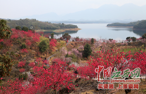 紅白嬌艷的桃花林讓人想起陶淵明筆下的《桃花源記》