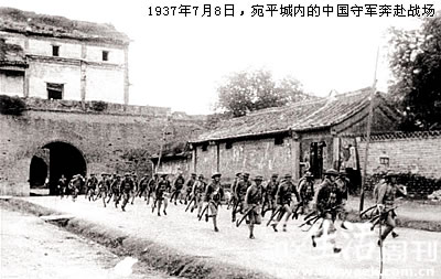 1937年,7月7日 日軍在盧溝橋回龍廟附近進行挑釁性的軍事演習,隨后,炮轟宛平城。中國守軍奮起抵抗,全國抗日戰(zhàn)爭從此開始。