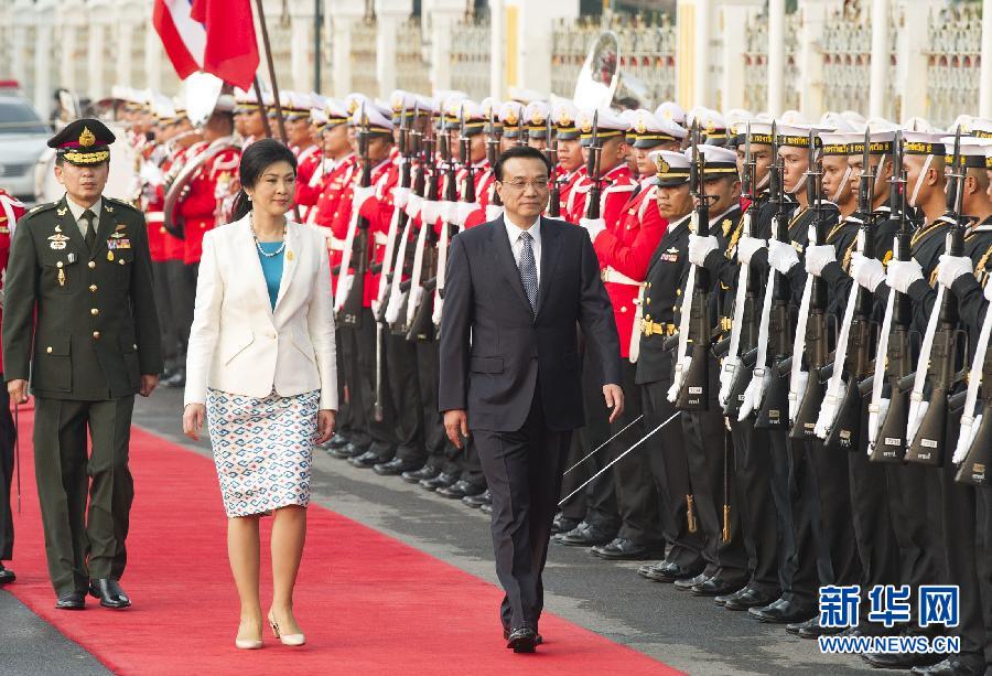 10月11日,國務(wù)院總理李克強在曼谷泰國總理府同泰國總理英拉舉行會談。這是會談前,英拉在總理府前廣場為李克強舉行隆重的歡迎儀式。新華社記者 黃敬文 攝