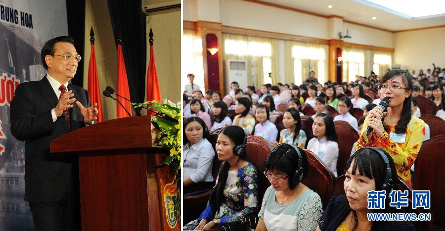 10月15日,國(guó)務(wù)院總理李克強(qiáng)來(lái)到越南河內(nèi)國(guó)家大學(xué),同中越兩國(guó)青年見(jiàn)面交流。這是李克強(qiáng)現(xiàn)場(chǎng)回答一位越南女青年的提問(wèn)。 新華社記者劉建生 攝