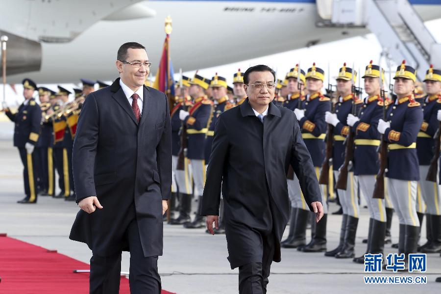 當?shù)貢r間11月25日下午,應(yīng)羅馬尼亞總理蓬塔邀請,國務(wù)院總理李克強乘專機抵達布加勒斯特廣達國際機場,開始對羅馬尼亞進行正式訪問。羅馬尼亞總理蓬塔到機場迎接并為李克強舉行隆重的歡迎儀式。新華社記者 姚大偉 攝