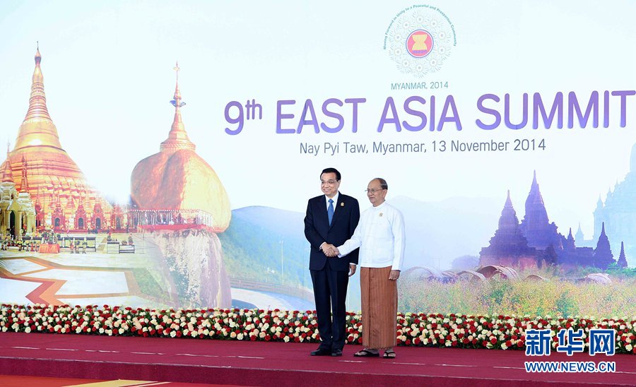 11月13日,中國國務(wù)院總理李克強(qiáng)在內(nèi)比都出席第九屆東亞峰會(huì)并發(fā)言。這是峰會(huì)開始前,東盟輪值主席國緬甸聯(lián)邦共和國總統(tǒng)吳登盛迎接李克強(qiáng)總理。新華社記者 李濤 攝