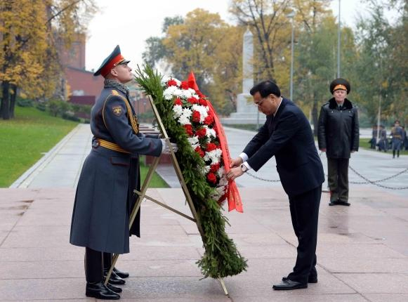 新華網(wǎng)北京10月14日電 據(jù)新華社“新華國際”客戶端報(bào)道,一場(chǎng)秋雨洗滌了莫斯科的寒夜。13日一早,克強(qiáng)總理來到克里姆林宮外的無名烈士墓,憑吊衛(wèi)國戰(zhàn)爭(zhēng)中的犧牲者。