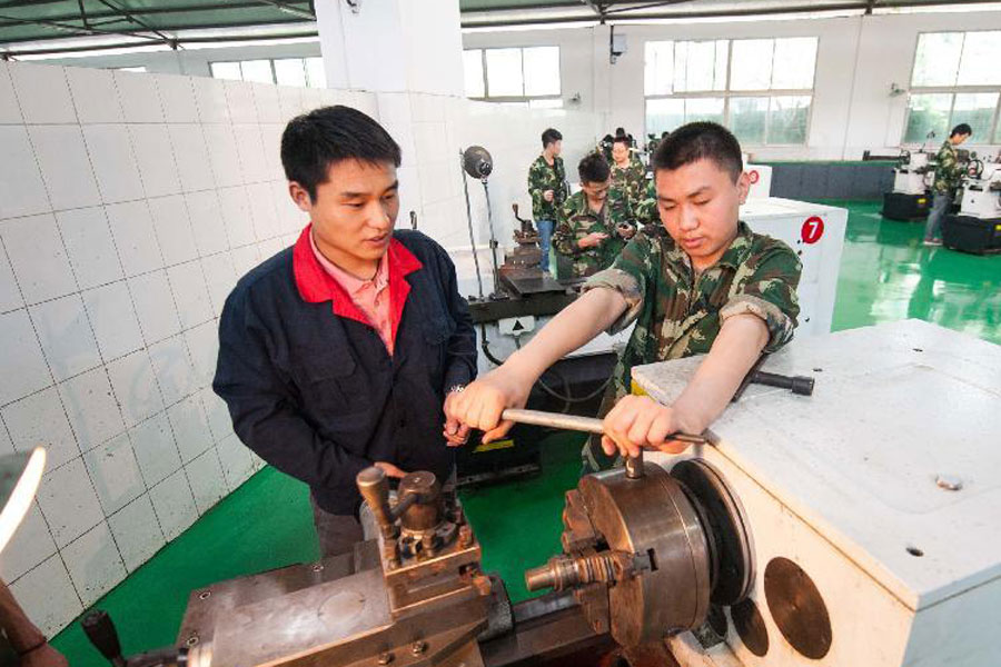 4月11日,在段仕兵就讀的重慶機械技師學院,重慶陸軍預(yù)備役后勤保障旅的一名軍官作為學生家長在向班主任雷田渝(右)了解段仕兵(中)的學習情況?鞚M17歲的段仕兵是四川省遂寧市大英縣人,2013年蘆山地震中,與他相依為命的父親不幸遇難。
