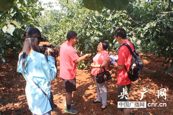 全國(guó)人大代表、湖北省丹江口市丹趙路辦事處茅臘坪村三組農(nóng)民辛喜玉(右二)在自家核桃園接受采訪