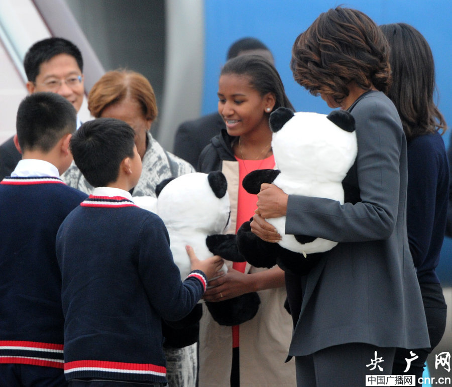 2014年03月24日,四川省成都市。下午18:50,米歇爾一行抵達(dá)成都雙流國(guó)際機(jī)場(chǎng),開(kāi)始對(duì)成都市的友好訪問(wèn)。米歇爾和女兒對(duì)成都小朋友送給她們的大熊貓玩偶愛(ài)不釋手。