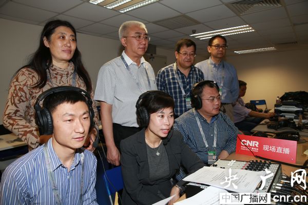 中央人民廣播電臺中國之聲、中華之聲,華夏之聲、香港之聲、央廣網(wǎng)現(xiàn)場直播慶祝大會和典禮的盛況。中央臺直播工作人員于直播開始前提前抵達直播現(xiàn)場進行直播準備。