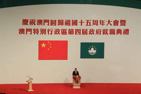 此時此刻,讓我們共同回憶15年前的今天。那一天,中國政府恢復對澳門行使主權,中華人民共和國澳門特別行政區(qū)成立。從此,澳門回到祖國懷抱,走上了同祖國內地優(yōu)勢互補、共同發(fā)展的寬廣道路。這是中華民族發(fā)展進程中具有重大歷史意義的事件,開辟了澳門發(fā)展新紀元。