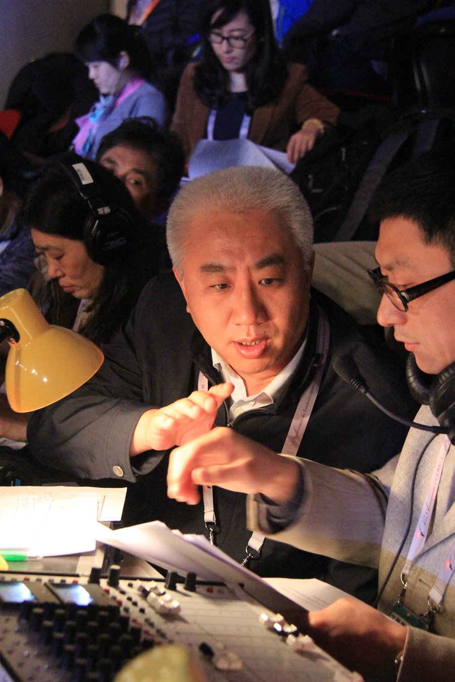中央臺(tái)副總編輯劉曉龍和主持人鵬飛交流直播細(xì)節(jié)(央廣網(wǎng)記者 趙凈 攝)