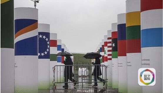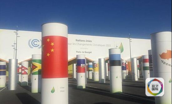 圖為氣候變化巴黎大會(huì)入口前的各國(guó)圓柱