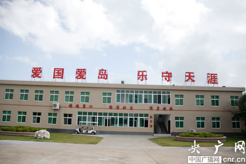 海軍某場(chǎng)站俱樂(lè)部樓上寫(xiě)著“愛(ài)國(guó)愛(ài)島,樂(lè)守天涯”的口號(hào)