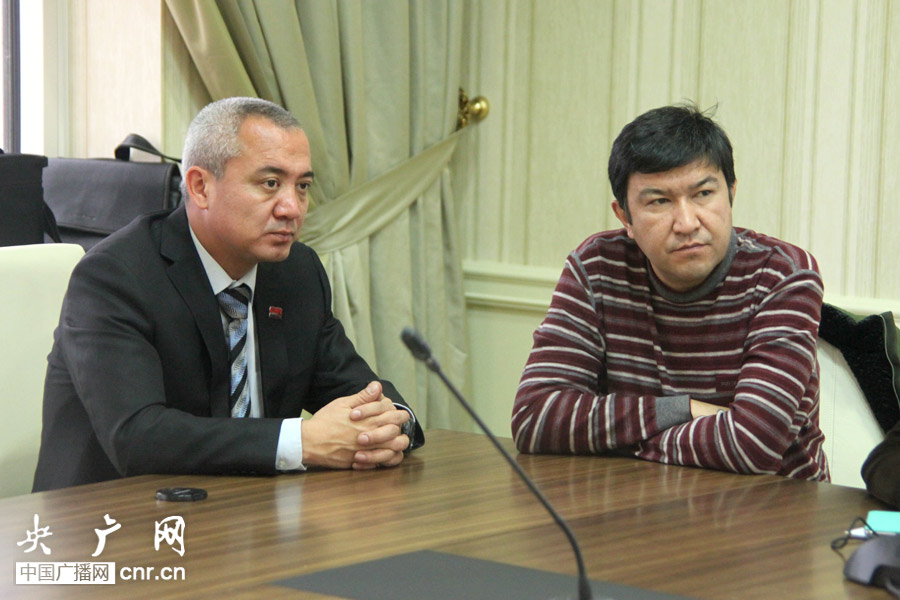 中央臺絲路采訪組葉里夏提(左)、巴哈提亞爾(右)在采訪中