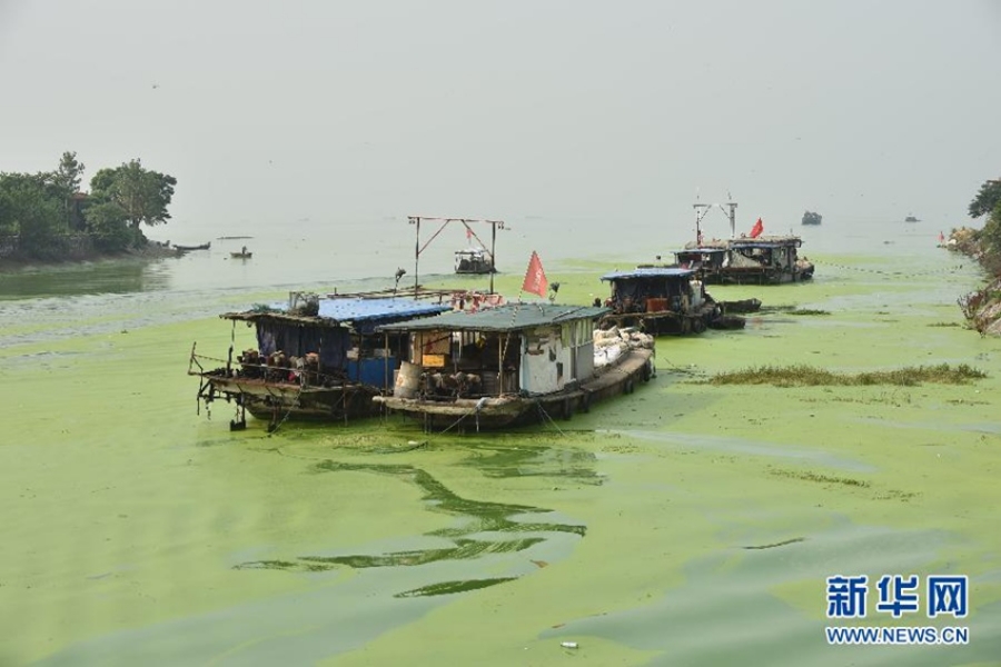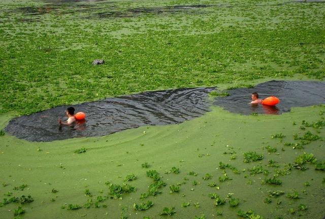 武漢漢江浮萍泛濫變“草原” 泳者戲水又踏青