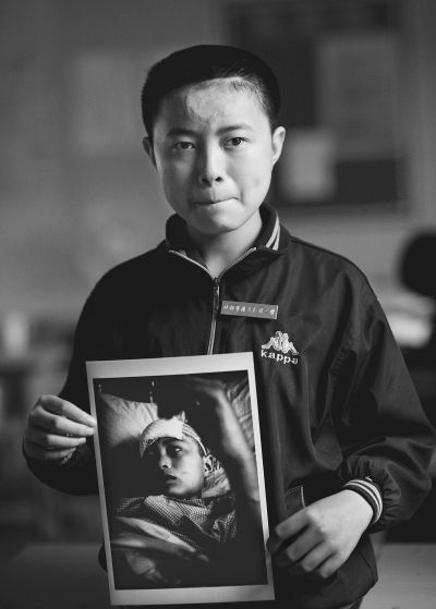 汶川地震1周年前夕,15歲的姜劉拿著地震后躺在病床上的照片。