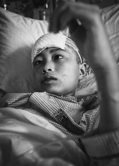 汶川地震大腦外傷失語的14歲的“什邡小子”姜劉躺在病床上。