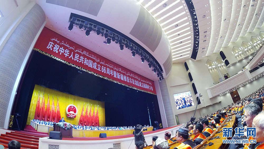 10月1日,慶祝中華人民共和國成立66周年暨新疆維吾爾自治區(qū)成立60周年大會在新疆人民會堂舉行。圖為大會現(xiàn)場。新華網(wǎng)記者 郭小天 攝