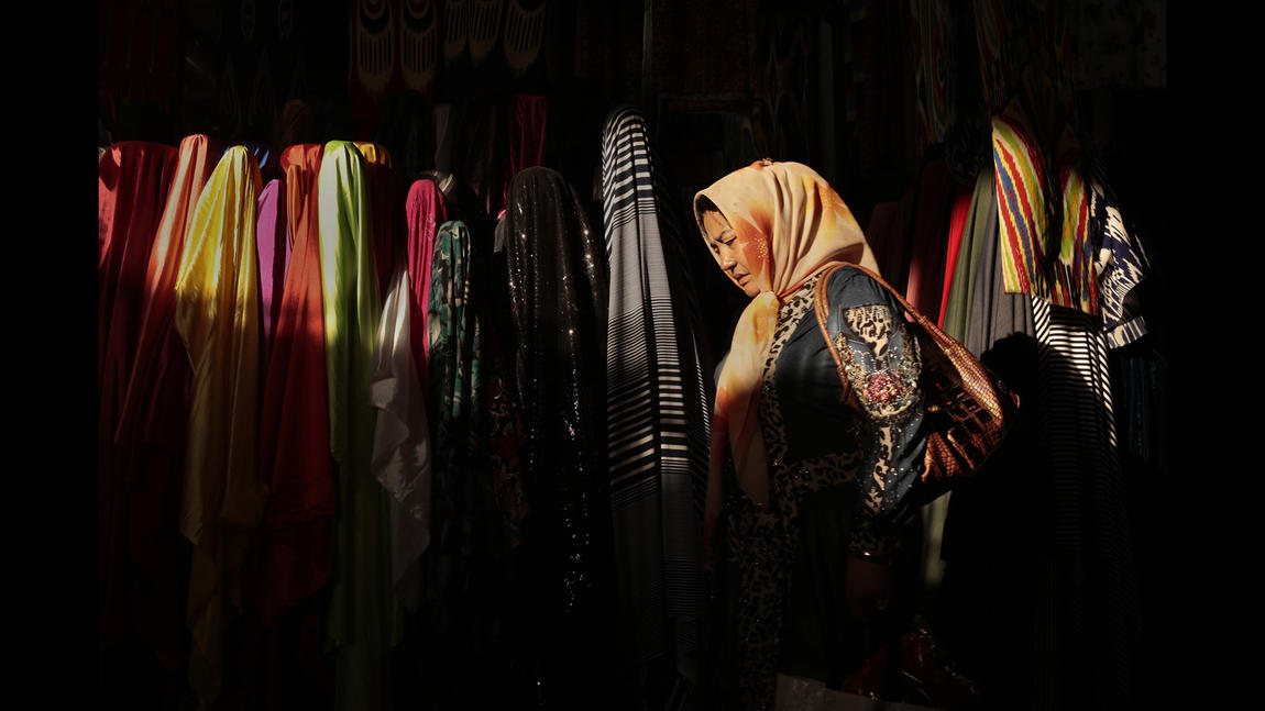 海外網(wǎng)9月1日電 據(jù)英國(guó)《衛(wèi)報(bào)》報(bào)道,《衛(wèi)報(bào)》記者前往中國(guó)新疆喀什地區(qū)進(jìn)行探訪,喀什,這座絲綢之路途徑的城市,擁有50萬(wàn)的居民,是維吾爾族人民的聚集地。圖為一個(gè)女人在商場(chǎng)采購(gòu),她們的穿著都很有當(dāng)?shù)靥厣,服裝很有伊斯蘭特色。付款處的牌子上寫(xiě)著:“把頭發(fā)挽起來(lái),露出我們漂亮的臉。拋棄那些舊式的過(guò)時(shí)的妝容。