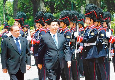 6月3日,正在意大利訪問的國家副主席習(xí)近平同意大利總理貝盧斯科尼舉行會談。這是習(xí)近平出席貝盧斯科尼舉行的歡迎儀式。