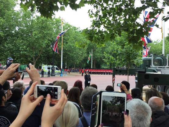 當(dāng)女王和親王的馬車駛過來之前,人群的歡呼聲、相機(jī)的快門聲也此起彼伏。我遠(yuǎn)遠(yuǎn)看到了戴著淡粉色帽子的女王和熊皮帽的菲利普親王。而比我勤勞、一早扛著單反搶到好位置的小伙伴,拍下了女王陛下向人群揮手致意的瞬間。