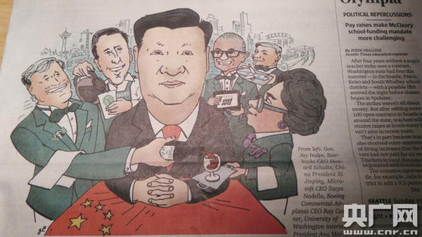 當?shù)孛襟w比如“西雅圖時報”,這是華盛頓州最大的日報,并且是在西北最大的周日發(fā)行的報紙。也是10個普利策獎得主,在今天,也就是當?shù)貢r間周日早上,報紙頭版頭條配有手繪圖的對習主席即將訪問的報道,大標題寫著“友好的華盛頓已經(jīng)鋪好了歡迎的地毯”。手繪圖上,習主席帶著紅色領(lǐng)帶坐在中間,身后從左至右先是華盛頓州州長杰伊·英斯利給他倒了一瓶名為產(chǎn)自華盛頓的紅酒,這位金色頭發(fā)的州長還給自己起了個很潮的中文名“周杰倫”、在他旁邊是準備了一杯星巴克的舒爾茨、而后是舉著有微軟標志的平板電腦的微軟CEO納德拉、捧著787模型的波音民用飛機集團總裁雷·康納、以及端著紅酒杯的華盛頓大學校長安娜·瑪麗·科斯?梢哉f,這張圖也非常形象地說明了當?shù)馗鹘鐚α曋飨L問的期盼。