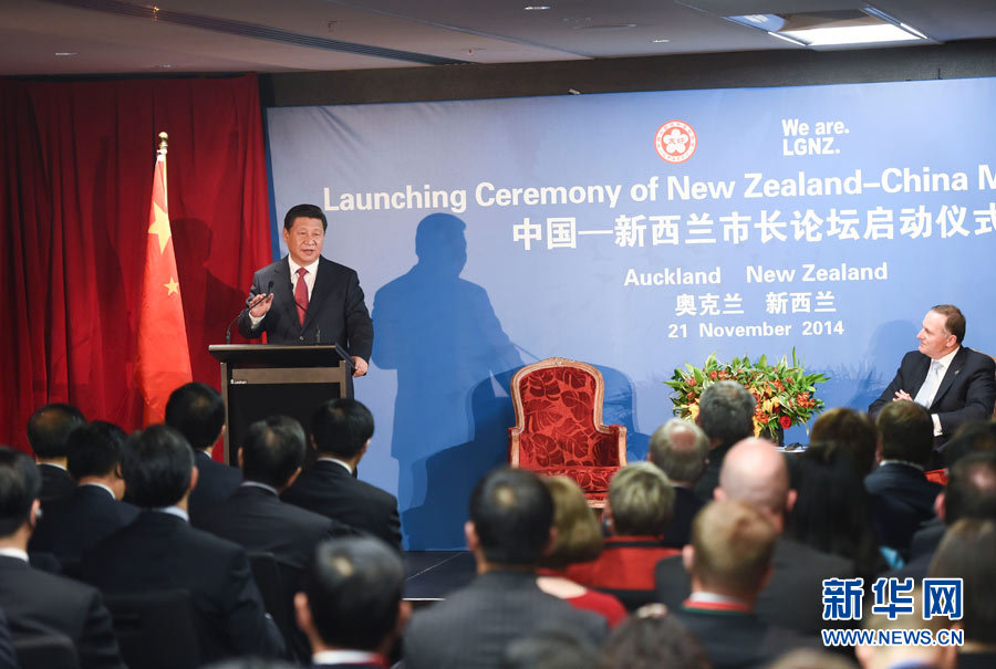 11月21日,中國國家主席習(xí)近平在奧克蘭和新西蘭總理約翰·基共同出席中國-新西蘭市長論壇啟動儀式。 新華社記者李學(xué)仁攝