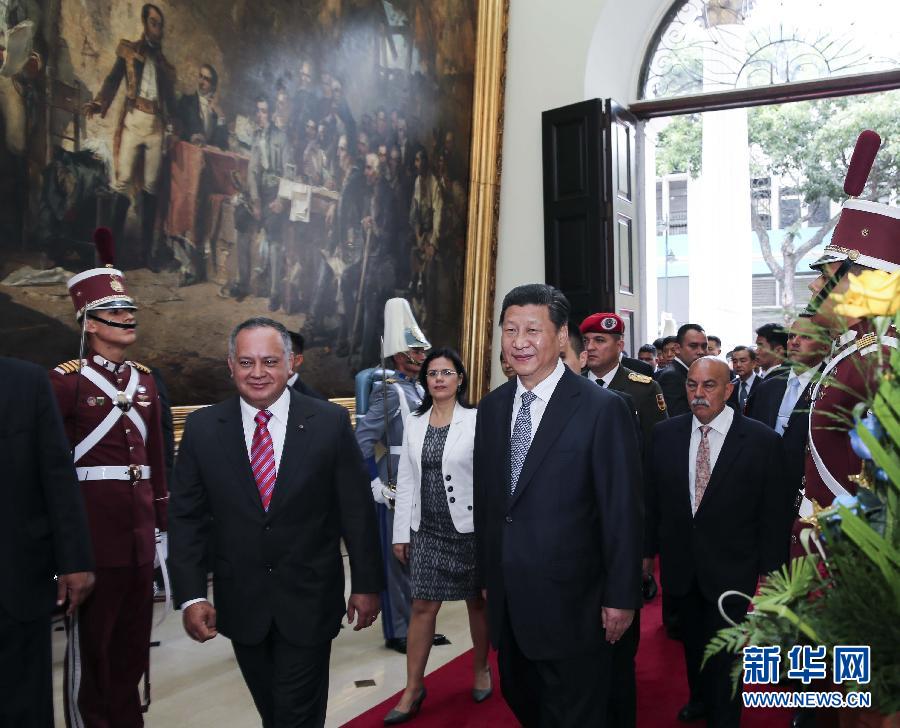 習(xí)近平抵達(dá)國會(huì)大廈,卡韋略率委內(nèi)瑞拉全國代表大會(huì)副主席、各專門委員會(huì)主席及主要議員歡迎。當(dāng)?shù)孛癖娮园l(fā)聚集在道路兩旁,向習(xí)近平歡呼致意,F(xiàn)場舉行了隆重歡迎儀式,軍樂隊(duì)奏中委兩國國歌,習(xí)近平在卡韋略陪同下檢閱儀仗隊(duì)。