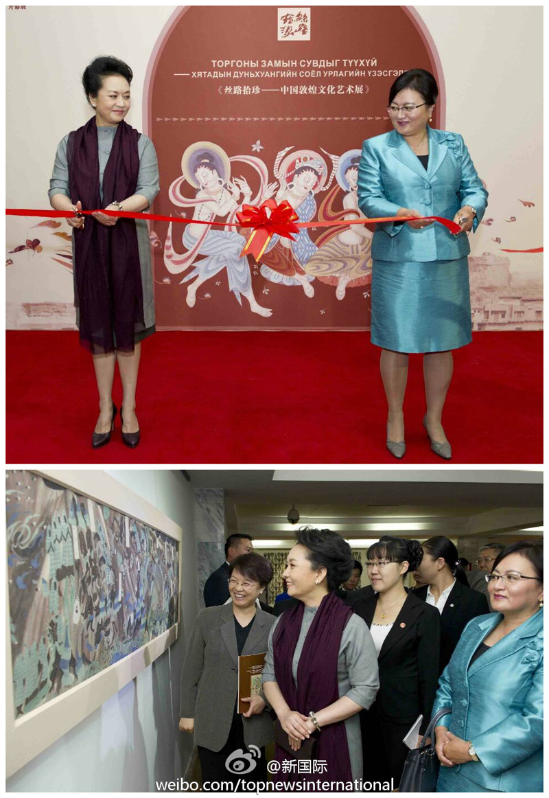 新華網(wǎng)北京8月22日電 據(jù)新華社“新國際”微博報道,習(xí)近平主席夫人彭麗媛和額勒貝格道爾吉總統(tǒng)夫人包勒爾瑪22日上午共同出席為慶祝中蒙建交65周年暨“中蒙友好交流年”舉行的中國文化周開幕式并剪彩,欣賞蒙古國藝術(shù)家的精彩演出,并參觀中國敦煌文化藝術(shù)展,觀賞臨摹的敦煌石窟壁畫、復(fù)制泥塑和樂器。