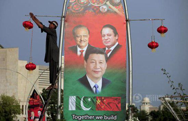 2015年4月19日,巴基斯坦首都伊斯蘭堡,工人懸掛大紅燈籠和印有巴勒斯坦總統(tǒng)侯賽因、總理謝里夫、中國國家主席習近平的畫像,歡迎習近平訪問巴基斯坦。