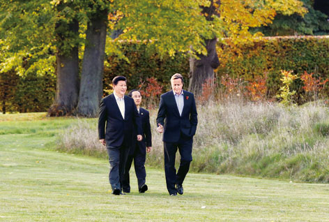 10月22日,國家主席習近平在契克斯首相鄉(xiāng)間別墅同英國首相卡梅倫再次會晤。這是習近平與卡梅倫漫步草坪,邊走邊談。