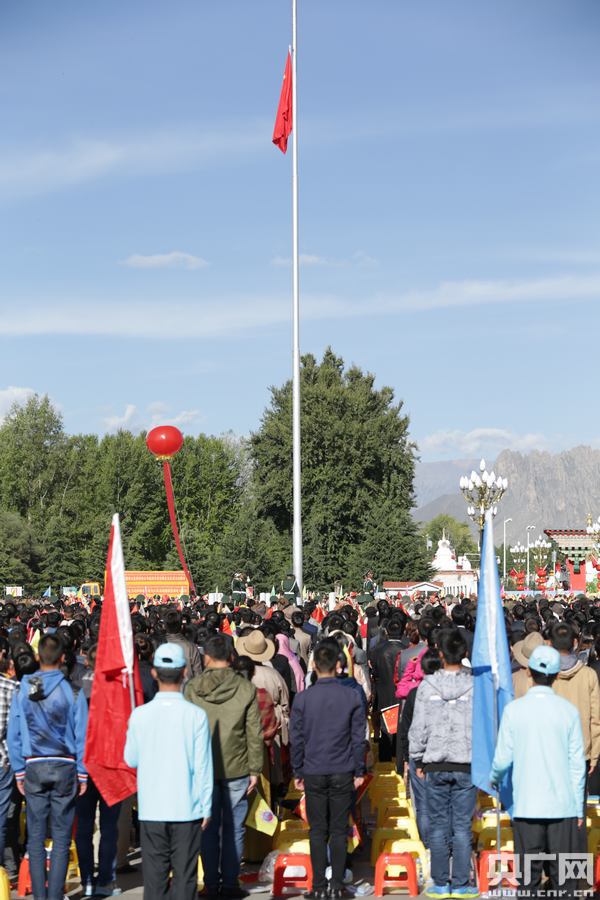 今年是西藏自治區(qū)成立50周年。9月8日上午10時,西藏自治區(qū)成立50周年慶祝大會在拉薩市布達拉宮廣場舉行。圖為慶祝大會升旗儀式。(央廣網(wǎng) 張瞳/攝)
