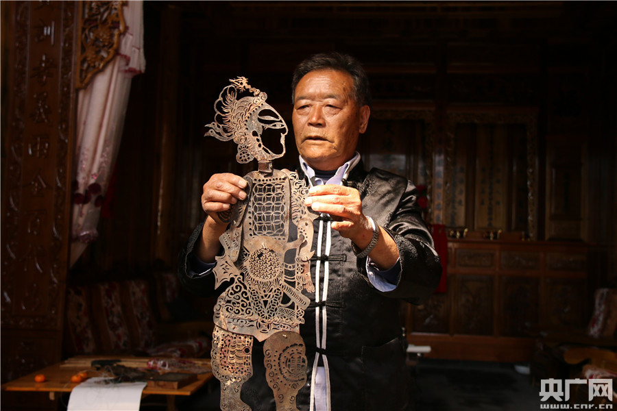 劉永周向記者展示最具歷史的皮影(吳海波 攝)