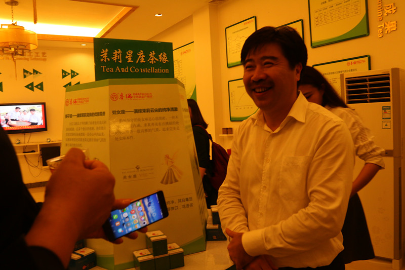 福建春倫集團(tuán)董事長(zhǎng)兼黨委書記傅天龍接受記者采訪,背后是星座茶宣傳區(qū)(吳海波 攝)