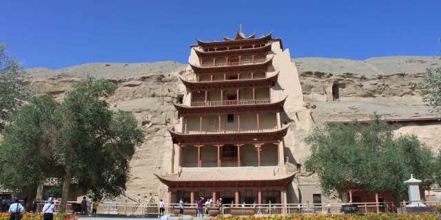 敦煌莫高窟俗稱千佛洞,位于敦煌市東南25公里鳴沙山東麓宕泉河崖壁上,南北長(zhǎng)約1600米。始建于前秦建元二年(公元366年),歷經(jīng)十六國(guó)、北魏、西魏、北周、隋、周、五代、宋西夏、元等朝代,營(yíng)造千年之久,現(xiàn)在洞窟492個(gè),其中珍存北涼至元各朝代繪制的壁畫45000多平方米,彩塑2400余身,飛天4000余身,唐宋木結(jié)構(gòu)建筑5座,蓮花柱石和鋪地花磚數(shù)千塊,是一處由建筑、繪畫、雕塑組成的博大精深的綜合藝術(shù)殿堂,是世界上現(xiàn)存規(guī)模最宏大、保存最完好的佛教藝術(shù)寶庫(kù),被譽(yù)為“東方藝術(shù)明珠”。