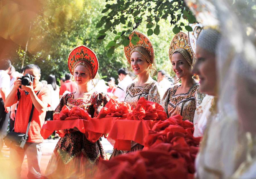 8月23日,幾位俄羅斯演員手捧花朵在中俄民族風情園內(nèi)迎客。